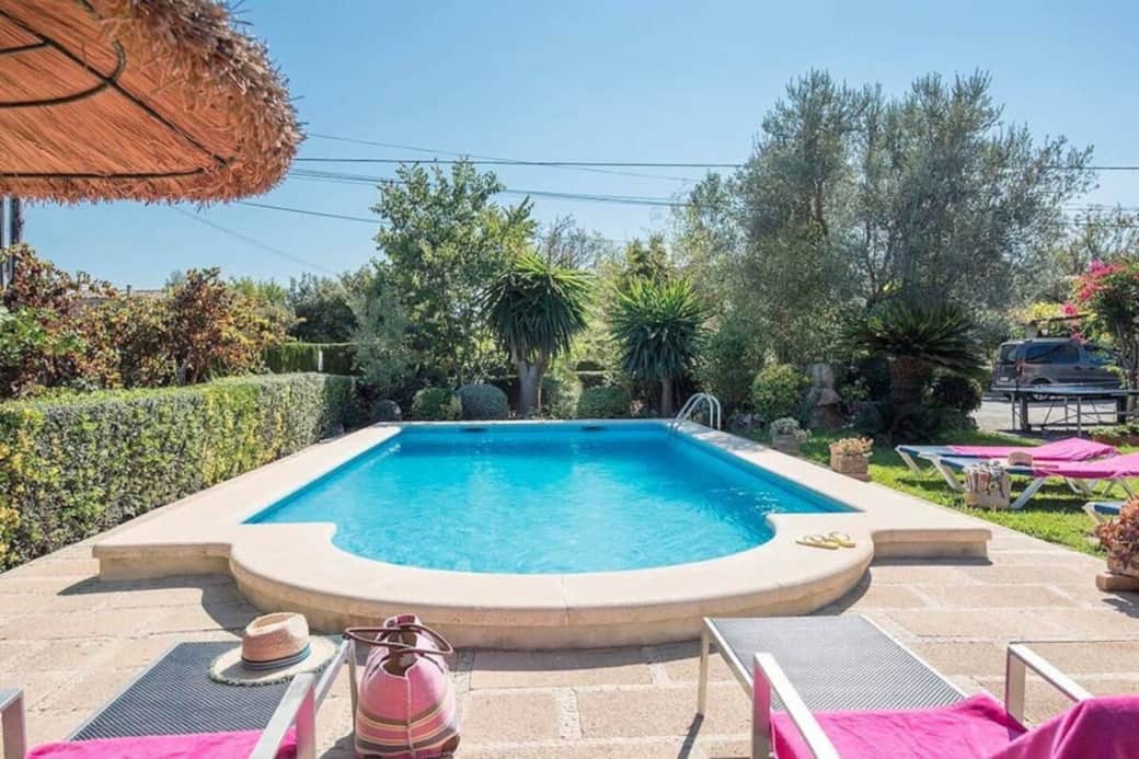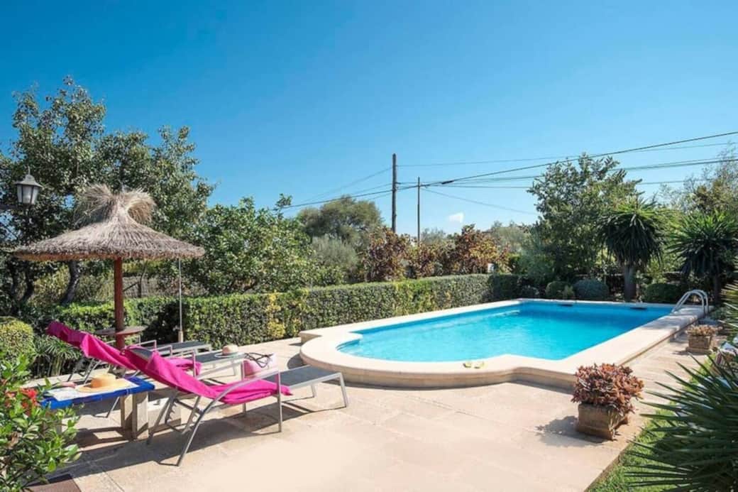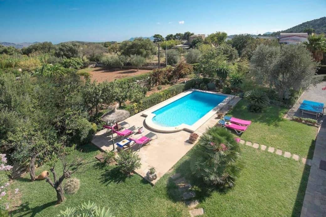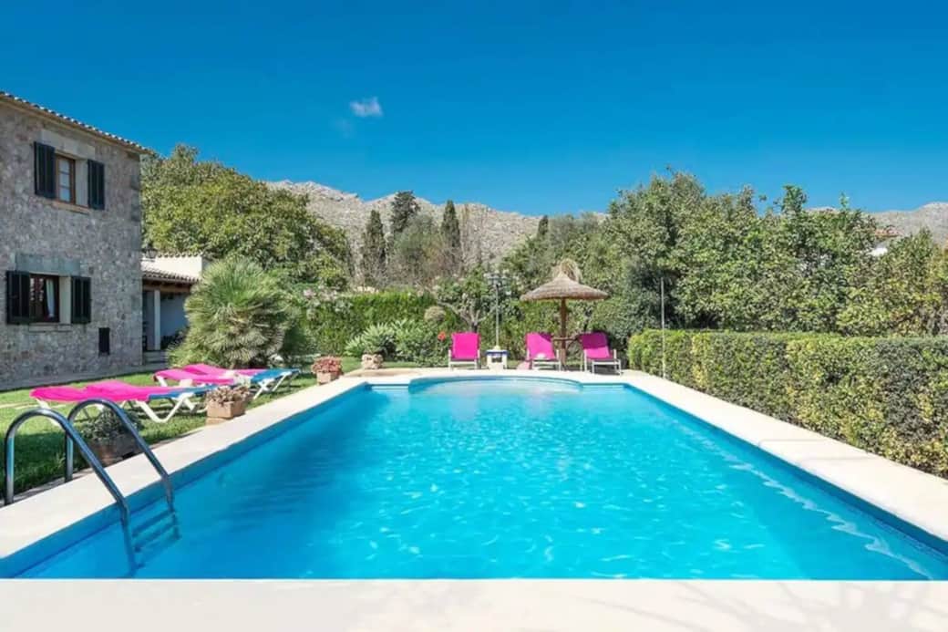 This attractive stone villa is surrounded by beautiful mature trees containing a wide variety of plants and shrubs. A lawned area surrounding the private pool provides the perfect place to relax in the sun and enjoy the beautiful mountain views. The house is located on a residential cul-de-sac shared by other holiday homes, yet still maintains a good degree of privacy. The famous and picturesque village of Pollensa, notable for its old town, is nearby; there are supermarkets and a couple of bars within walking distance. Inside, the house is traditionally furnished and decorated with beamed ceilings and terracotta floors. We enter the villa through the main door next to the front terrace, which leads directly into the spacious living and dining room. To the right, a door leads to the fully equipped kitchen, complete with all the necessary equipment in a vacation home. On this level of the house, there is also a double bedroom and a separate bathroom with a shower. The remaining bedrooms are located upstairs. They consist of two doubles and one twin, as well as a full bathroom. All bedrooms have air conditioning (with limited hours). Outside, there is a beautiful barbecue, ideal for those who love al fresco dining. The pool is surrounded by grass and has steps.